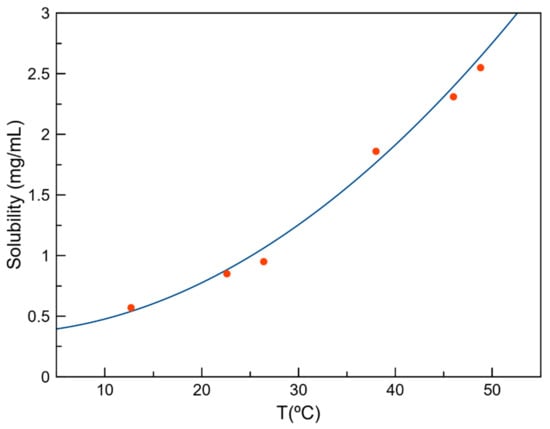 Solubility studies were performed using the Crystal16 equipment (Technobis Crystallization Systems, Alkmaar, The Netherlands) in water. The equipment comprised four individually controlled reactors, each with a working volume of 1 mL, allowing the measurement of cloud and clear points based on the turbidity of 16 aliquots of 1 mL of solution in parallel and automatically. Each solution was heated at 0.3 °C/min from 20 to 90 °C with a magnetic stirring rate of 700 rpm, held at this temperature for 10 min and then cooled to 20 °C at 0.3 °C/min. The dissolution temperature for each compound was measured using different amounts of solid, and the solubility data of the pure components were fitted to a quadratic equation [] using the CrystalClear software (Technobis Crystallization Systems, Alkmaar, The Netherlands).