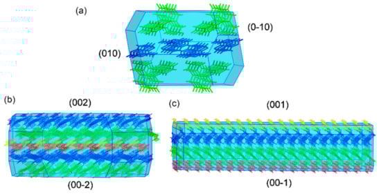 BFDH-predicted morphologies of (a) DIC–ADE I (green: DIC, blue: ADE); (b) DIC–CYT (blue and green: DIC, yellow and red: CYT), and (c) DIC–ICT (DIC: blue and green: ICT: red and yellow), showing the largest faces.
