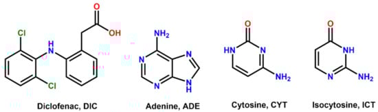 Chemical formula of diclofenac (DIC), adenine (ADE), cytosine (CYT), and isocytosine (ICT).