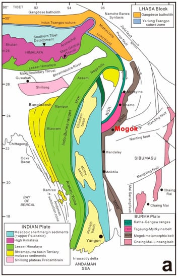 - Mitchell, A.; Htay, M.T.; Htun, K.M.; Win, M.N.; Oo, T.; Hlaing, T. Rock relationships in the Mogok metamorphic belt, Tatkon to Mandalay, central Myanmar. J. Southeast Asian Earth Sci. 2007, 29, 891–910. [Google Scholar] [CrossRef]