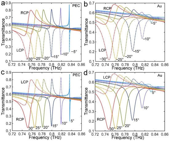 Transmittance spectra of the chiral metasurface under RCP and LCP illuminations for (a) the ideal (PEC) case and (b) the lossy (gold) case, with the rotation angle changing from −5° to −30°. Transmission spectra of the chiral metasurface under RCP and LCP illuminations for (c) the ideal (PEC) case and (d) the lossy (gold) case, with the rotation angle changing from 5° to 30°.