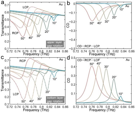 Please note the quasi-BIC state mentioned above is induced by rotating the gap angles for the upper and bottom layers at the same time. It is also of vital importance to investigate the contribution of each layer by separately rotating the gap angles of the upper layer and bottom layer. Figure 5a,b display the far-field spectra when the upper layer gap angle rotates from 10° to 50°. Compared with the results shown in Figure 3, the CD is strongly suppressed. However, the transmittance difference between LCP and RCP can reach its maximal value close to the results in Figure 3 when only the bottom layer gap angle rotates (Figure 5c,d). This observation manifests that the chiroptical response in quasi-BICs is mainly due to the symmetry breaking in the bottom SRR layer.