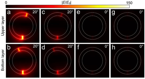 The near-electric field distributions at the rotation angle of 20° illuminated by (a,b) the RCP wave and (c,d) the LCP wave. The near-electric field distributions at the rotation angle of 0° illuminated by (e,f) the RCP wave and (g,h) the LCP wave.