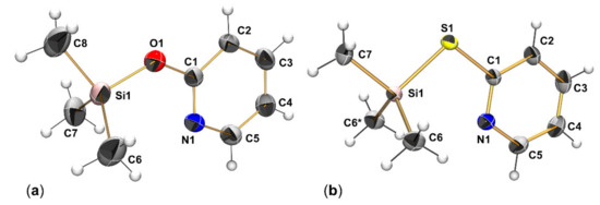 Selected parameters of unit cell, data collection and structure refinement of 1a and 1b are summarized in Appendix A (Table A1). Compound 1a (Figure 2) crystallized in the orthorhombic space group Pbca with two molecules in the asymmetric unit. Compound 1b (Figure 2) crystallized in the monoclinic space group P21/m. The asymmetric unit comprises one half of the molecule because of its location on a crystallographic bisecting plane. In both compounds the pyridine N atom approaches the Si atom from far distance (ca. 3.0 Å), which is much longer than the sum of their covalent radii (1.82 Å [49]) but still shorter than the sum of van der Waals radii (3.65 Å [50]). Thus, it can be regarded as a remote [4+1]-coordination. The effects of Si-hypercoordination on the Si coordination sphere, however, are marginal; the lengthening of the N⋅⋅⋅Si trans-bond (with respect to the other Si-C bonds in the same molecule) lies between 3σ and 6σ, and the sum of idealized equatorial bond angles with respect to the N-Si-C axis (332.7° and 332.0° for the two molecules in the structure of 1a, 335.5° for 1b) still reflects the close to tetrahedral Si coordination sphere. Furthermore, the geometry parameter τ4′ [51] (as a measure for the distortion of the tetrahedral coordination sphere) is still very close to 1 (0.96 and 0.97 for the two independent molecules of 1a, 0.96 for 1b). Additionally, the C-X-Si (X = O, S) angles in compounds 1a and 1b are even wider than corresponding angles in aryl-X-SiMe3 compounds. Whereas in 1a, C-O-Si angles are 127.3(1)° and 128.4(1)°, 1,4-bis(trimethylsiloxy)benzene exhibits C-O-Si angles of 126.1(1)° and 126.7(1)° [52]. Whereas in 1b, the C-S-Si angle is 103.13(6)°, the azo-dye Et2N-C6H4-NN-C6H4-S-SiMe3 exhibits a C-S-Si angle of 98.46(6)° [53]. This can be explained by the torsion about the C-O or C-S bond in those aryl-X-SiMe3 compounds, which drives the Si-O or Si-S bond out of the aryl plane and thus lowers the steric demand (in terms of repulsion with SiMe3) of the aryl group.