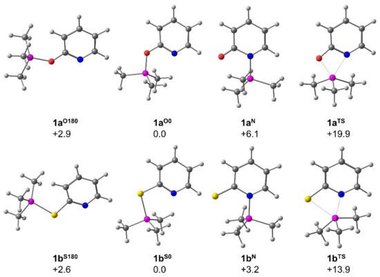 The full optimization of the two conformers of Si-X-bound compounds 1a and 1b essentially confirmed their energetic difference (in Gibbs free energy at 293 K) of ca. 3 kcal·mol−1. The alternative isomer of 1a and 1b with Si-N bound pyridine derivative was found to be less stable by 6.1 and 3.2 kcal·mol−1, respectively (Figure 4). Thus, in dynamic equilibria these isomers may still play a minor role. Especially in case of 1b, the transition state for the interconversion of the two isomers into one another (13.9 kcal·mol−1) is feasible at ambient temperature. The greater energetic difference in case of the isomers of 1a is in accord with the oxophilicity of silicon, and the higher energetic barrier posed by the transition state (19.9 kcal·mol−1) indicates a pronounced kinetic hindrance for the formation of isomer 1aN as well.