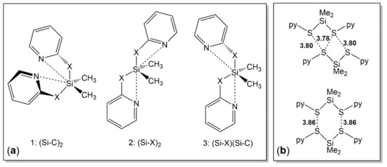 Besides those similarities, the presence of two pyX groups in compounds 2a and 2b gives rise to the formation of different conformers within the portfolio of [4+2]-coordination setups. Figure 6a illustrates the three conformations, which differ in the set of axial arrangements: Conformer 1 features two N⋅⋅⋅Si-C axes (i.e., the pyridine N atoms are capping tetrahedral faces opposite to an Si-C bond). This conformation is encountered in the solid state structure of 2a. Conformer 2 features two N⋅⋅⋅Si-X axes (i.e., the pyridine N atoms are capping tetrahedral faces opposite to the Si-X bonds, X being the anchor atom of an adjacent pyX moiety). This conformation is encountered in the solid state structure of 2b. Last but not least, conformation 3 with an N⋅⋅⋅Si-X and an N⋅⋅⋅Si-C axis should be feasible, but has not been encountered within these crystal structures, however. As the capping of tetrahedral faces trans to rather electronegative atoms X should be favorable because of N→Si lone pair donation into a lower lying σ*(Si-X) molecular orbital, the conformation 2 (as encountered with 2b) was rather expected, whereas the presence of conformer 1 in the structure of 2a was rather surprising. In dimethylsilicon carbamates Me2Si(-O(O=)C-NRR’)2 it is a common feature that the carbonyl O atoms are capping tetrahedral faces trans to Si-O bonds [55,56,57,58]. Therefore, we will have a closer look at the energetic differences between the conformers of compounds 2 in Section 3.2.3.