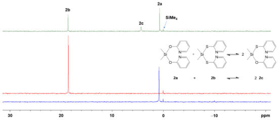 Stack plot of 29Si{1H} NMR spectra of (from bottom to top) a 0.88 M solution of 2a in CDCl3 (blue trace), a 0.88 M solution of 2b in CDCl3 (red trace) and of an equimolar mixture of these stock solutions (green trace) as well as a reaction scheme and signal assignment. We attribute the signal broadening for 2c to dynamic effects in the Si coordination sphere (cf. Section 3.2.3, computational analyses of conformers and isomers of compound 2c).