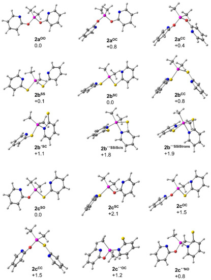 As the computational analysis of compound 1b revealed that the isomerization of the pyS ligand into its Si-N bound form (cf. Section 3.1.2) may be associated with rather low energy difference, we considered isomers with Si-N bound pyS and/or pyO group(s) in the computational analyses of compounds 2 as well. The set of molecular structures derived therefrom, as well as their energies, can be found in the supporting information. For compound 2a the isomers with at least one Si-N bound pyO group are noticeably less stable (relative Gibbs free energy +5.6 kcal·mol−1 or more with respect to 2aOO). For compound 2b, three further isomers relatively low in energy were found upon changing one (2b’SC +1.1 kcal·mol−1) or two pyS groups into Si-N binding mode (2b’’SSiScis +1.8 kcal·mol−1 and 2b’’SSiStrans +1.9 kcal·mol−1). The Si coordination sphere of the former resembles a trigonal bipyramid with S-Si-S axis, the latter two are related to two isomers with rather octahedral Si coordination sphere and cis-disposed methyl groups (with cis-disposed S-Si-S bonds in one and trans-situation in the other). These isomers indicate that, in a dynamic equilibrium, Si hypercoordination may play a role in solutions of compound 2b. In fact, with respect to 2a (Δδ = +0.3 ppm) the 29Si NMR shift of compound 2b is more responsive to change of solvent and exhibits a slight upfield shift of the signal when using toluene-d8 instead of CDCl3 as NMR solvent (Δδ = −0.6 ppm). However, this effect may also originate from varying contributions of other conformers and is not unequivocally speaking for the influence of Si hypercoordination. For compound 2c, two isomers low in energy with Si-N bound pyS group were encountered (2c’’OC +1.2 kcal·mol−1 and 2b’’NO +0.8 kcal·mol−1), both exhibiting a rather trigonal-bipyramidal Si coordination sphere with O-Si-S axis.