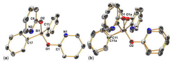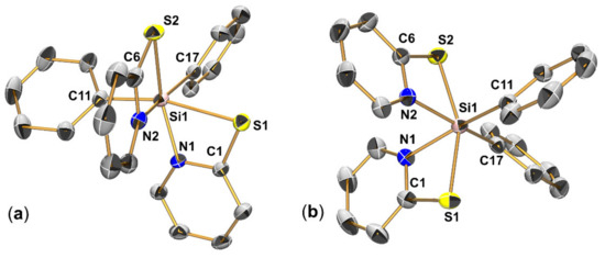 Selected parameters of unit cell, data collection and structure refinement of 2a and 2b are summarized in Appendix A (Table A1). Compounds 2a (in space group P21/c) and 2b (in space group P) both feature two crystallographically independent but conformationally very similar molecules in the asymmetric unit. For each of them, a representative example is shown in Figure 5. As found for 1a and 1b (cf. Section 3.1.1), compounds 2a and 2b feature essentially tetracoordinate Si atoms, the coordination spheres of which can be described as a remote [4+2]-coordination. Once again, Si⋅⋅⋅N contacts with interatomic separations around 3.0 Å complement the tetrahedral coordination sphere, and the Si-O-C- and Si-S-C angles in 2a and 2b, respectively, are similar to those in 1a and 1b, respectively. With respect to the geometry parameter τ4′ [51], the distortion of the almost tetrahedral coordination sphere of 2a (0.96 and 0.94 for the two independent molecules) is less pronounced than for 2b (0.91 for both of the two independent molecules).