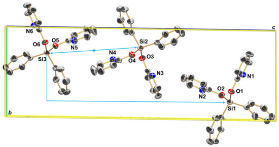 Selected parameters of unit cell, data collection and structure refinement of 3a are summarized in Appendix A (Table A1). Compound 3a (Figure 9) crystallized in the triclinic space group P1, and the asymmetric unit consists of three individual molecules of 3a, which adopt the same conformation. That is, their Si atoms are tetracoordinate and the N atoms cap the tetrahedral faces trans to the Si-C bonds (as in 2a). Additionally, on all three sites the same motif of disorder is present (cf. Figure 9b). That is, the formal site exchange of one pyO group and one phenyl group, while the remaining pair of pyO and Ph groups essentially remains on their places and just responds to the slightly different spatial demand of the neighboring groups. Even though this disorder lowers the precision of bond lengths and angles, the rather high occupancies of the predominant parts allowed for their refinement without restraints (restraints were applied to the low occupancy parts only) and the data obtained give a reasonable impression of the molecular conformations. Selected data of molecule 1 will be discussed as a representative example. Even though the geometry parameter τ4′ [51] hints at rather weak distortion (0.94) as it accounts for the deviations of angles from the tetrahedral angle regardless of atom type, the distortion of the tetrahedral Si coordination sphere is both slightly more pronounced than in compound 2a and, moreover, the deviations from tetrahedral angle are counter-VSEPR; i.e., the C11-Si1-C17 angle, which should be somewhat wider than 109.5° according to VSEPR, is 108.88(13)°, whereas the O1-Si1-O2 (113.31(11)°) angle is widened. This kind of deformation can be rationalized by the type of capping of tetrahedral faces: as N1 approaches Si1 trans to C17, the tetrahedral face Si1(O1,O2,C11) will be widened, thus widening the O1-Si1-O2 angle and compressing the C11-Si1-C17 angle. Analogously, as N2 approaches Si1 trans to C11, the tetrahedral face Si1(O1,O2,C17) will be widened, thus widening the O1-Si1-O2 angle again and compressing the C11-Si1-C17 angle again. The intramolecular Si⋅⋅⋅N contacts (separations Si1⋅⋅⋅N1 2.966(3) Å, Si1⋅⋅⋅N2 2.936(4) Å) are similar to those in 2a, however. Thus, the lowered steric demand of the phenyl groups (with respect to the methyl groups in 2a), which arises from their ability to adapt to steric requirements by torsion about the Si-C bond, is expected to be the origin of the pronounced distortion of the tetrahedral Si coordination sphere in 3a. The Si1-O1-C1 and Si1-O2-C6 angles (126.7(2)° and 125.6(3)°, respectively) are also similar to the corresponding angles in 2a. Thus, the remote N→Si coordination in the diphenylsilicon compound 3a is a similar to the situation in the methylsilicon compounds 1a, 2a and MeSi(pyO)3 [10] as well as in compound Si(pyO)4 [10].