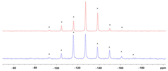 29Si CP/MAS NMR spectra of isomers 3b1 (bottom, blue trace) and 3b2 (top, red trace) recorded at a spinning frequency of 900 Hz. The isotropic chemical shifts are almost identical (δiso = −127.2 and −127.3 ppm, respectively). The different chemical shift anisotropy features of the two isomers are obvious from the spinning sidebands (asterisked peaks).