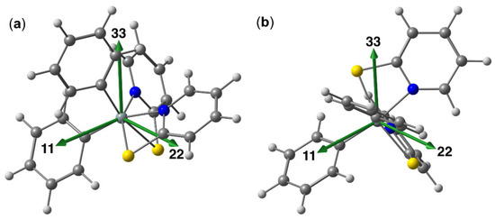 Interestingly, in compound 3b1 one principal component is particularly well shielded (positive skew of the CSA tensor), a feature which has also been found with hexacoordinate diorganosilicon complexes with a salen-type ligand (with SiO2N2C2 coordination sphere and trans-C-Si-C axis) [61] and with paddlewheel-shaped complexes with SiN4ClE (E = Ge, Sn) coordination spheres (N4 equatorial plane and Cl-Si-E axis) [62]. In contrast, the CSA tensor of 3b2 features one considerably less shielded component (i.e., negative skew). This feature has been encountered with the pyridine and bipyridine complexes of dichlorosilane [6,63]. Figure 14 illustrates the directions of the principal components of the 29Si CSA tensor with respect to the Si coordination sphere for compounds 3b1 and 3b2. As the Si coordination spheres are highly distorted, far from octahedral, they exhibit hardly any idealized symmetry axes, which should coincide with a particular principal axis of the CSA tensor. In compound 3b1, the particularly well shielded direction (33) is close to perpendicular to the idealized Si,N,N- plane of the molecule, thus (with some offset) pointing along the direction of a C-Si-S axis. The two principal components of lower shielding are located close to within this plane. In compound 3b2, one component (11) is particularly less shielded. The molecule nearly exhibits C2 symmetry (the idealized two-fold axis passing through and bisecting the N-N-, S-S- and C-C-axes), and from the principal components the direction of component (11) is closest to this idealized axis, but nonetheless exhibits a noticeable offset therefrom.