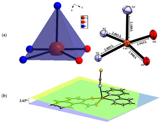 The following supporting information can be downloaded at: https://www.mdpi.com/article/10.3390/cryst12081066/s1, Figure S1: The copper square-pyramidal environment (a), and the dihedral angle between the two ligands (b) of C-2; Table S1: Selected experimental and calculated bond lengths (Å) and angles (°) for C-1; Table S2: Selected experimental and calculated bond lengths (Å) and angles (°) for C-2.