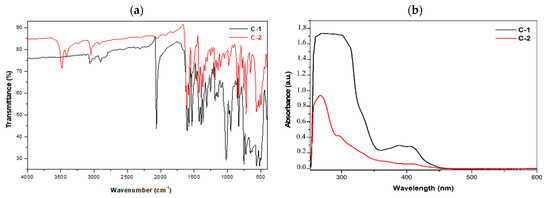 Figure 5b shows the UV-visible spectra in the range of 280–440 nm for C-1 and C-2. The absorption peaks of these two complexes are very similar. Nevertheless, those of C-2 are very weak. In the UV region, the two complexes show peaks near 290–300 nm due to the π → π* aromatic ring. Moreover, we noticed two intense peaks, or a shoulder, in the (305 → 315 nm) (I)—(310 → 325 nm) (II) region, which can be assigned to the charge transfer between the ligand and the metal.