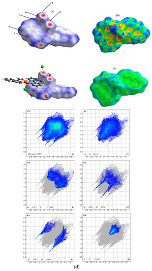 The relative contributions of the H···H, H···C/C···H, H···O/O···H, H···Cl/Cl···H and H···N/N···H contacts to the Hirshfeld surface in the C-2 complex are determined using the 2-D fingerprint plots, as illustrated in Figure 7d. As in the C-1complex, the fingerprint plots of the C-2 complex show that the H···H contacts provide the most significant contribution to the Hirshfeld surface (45.1%).
