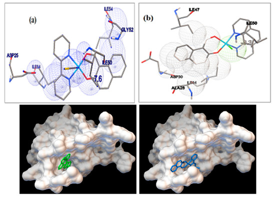 The upper panel shows the molecular docked model of C-1 (blue color) and C-2 (green color) in the HIV-1 protease active pocket. The enzyme is shown as a surface; the lower panel shows the best-docked conformation of C-1 (a) and C-2 (b) in the binding site of HIV-1.