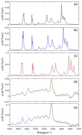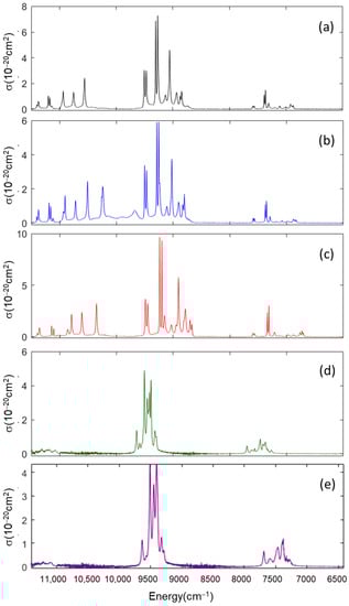 Figure 4a–c for all investigated compounds. This transition appears as a series of separated groups of peaks of increasing intensity. The highest emission cross-section is observed at around 2.1 μm in all compounds.