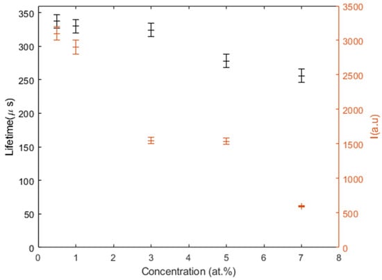 3, we investigated the dependence of the emission intensity and of the lifetime as a function of the doping level from 0.5% to 7%. The results are shown in