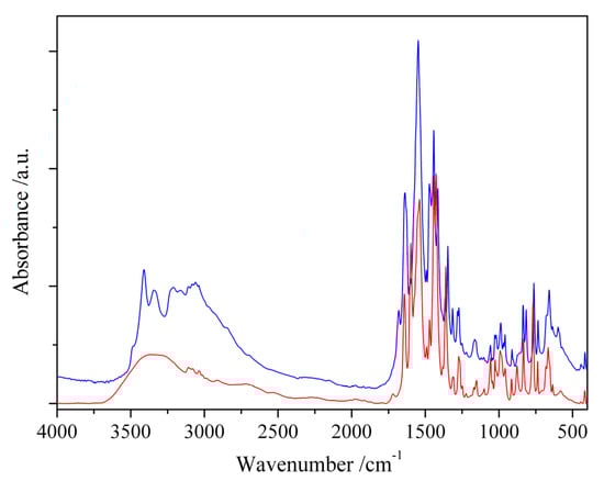 IR spectra of [Ni(bpy)(acr)2(H2O)] (red) and [Ni(bpy)(acr)2(H2O)]·MA (blue).