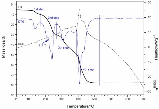 Chemical analysis of carbon, nitrogen and hydrogen has been performed using a PE 2400 analyzer (Perkin Elmer, Waltham, MA, USA). The IR spectra were recorded in KBr pellets with a Tensor 37 spectrometer (Bruker, Billerica, MA, USA) in the range 400–4000 cm−1. Electronic spectra were recorded on solid samples (using Spectralon as standard) in the range 200–1500 nm on a V670 spectrophotometer (Jasco, Easton, MD, USA). The simultaneous TG/DSC-MS measurement was performed on a Mettler Toledo (Greifensee, CH, Switzerland) TGA/DSC1 instrument, coupled to a Pfeiffer Vacuum ThermoStar (Asslar, Germany) mass spectrometer. An amount of 2.6979 mg of the sample was placed into 150 µL platinum crucible and heated from 25 to 800 °C, with a heating rate of 5 K min−1, in an air atmosphere, with a flow rate of 50 mL min−1. An empty crucible served as a reference. The blank curve was subtracted. Evolved gases were introduced into mass spectrometer via 75 cm long heated capillary.