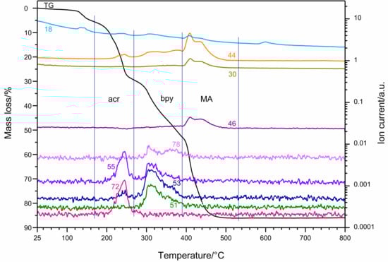 Dynamic thermogravimetric measurement (TG) in air showed (Figure 5) that the complex 1 [Ni(bpy)(acr)2(H2O)] MA is thermally stable up to 108 °C, followed by dehydration up to 168 °C; this is seen as a weak endothermic effect on the DSC curve. The temperature range of mass loss was determined by the first derivative of the TG curve (DTG curve). In the second step, the fission of the two acrylate ions is monitored for the next 100 °C. The decomposition is sequential, since at 215 °C the slope on the TG curve changes, as could be seen as a shoulder on the DTG curve and a ratio of 7.9: 16.6% weight loss, which is about 1: 2, proving the two different coordination modes of the acrylate ion, which is consistent with the crystal structure (Scheme 1). The evolution of the gaseous products is shown on the TG–MS curve (Figure 6), where in the temperature range between 168–268 °C the signals typical of the acrylate ion and its rich fragmentation appear (m/z = 72, 55, 44, 53 and 58, 56, 52 not shown here) in accordance with database of the National Institute of Standards and Technology (NIST) [42]. The temperature interval of mass loss of the two acrylate ligands is consistent with the TG observations of the cobalt(II)-melamine complex, which otherwise contains no bpy ligand [17].
