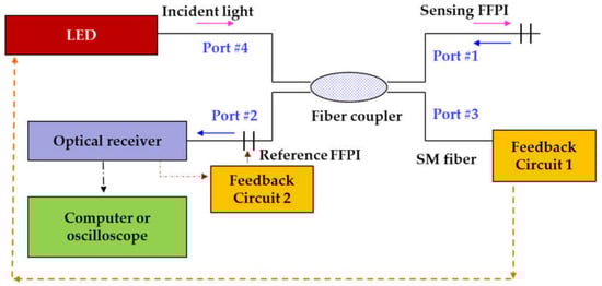 A dual FFPI sensor [30,49] with a diode light source was explored to sense the continuous-wave temperature variation. Using this characteristic, the applications are expanded to dynamic sensing. As shown in Figure 2, the FFPI sensing system is composed of a sensing FFPI, a reference FFPI, an LED driver, a 50/50 fiber coupler, a feedback circuit, and an optical receiver. This working principle is similar to an electronic circuit design [53], which works at the operating point with direct-current bias and then processes the small dynamic signal via amplification or filtering.