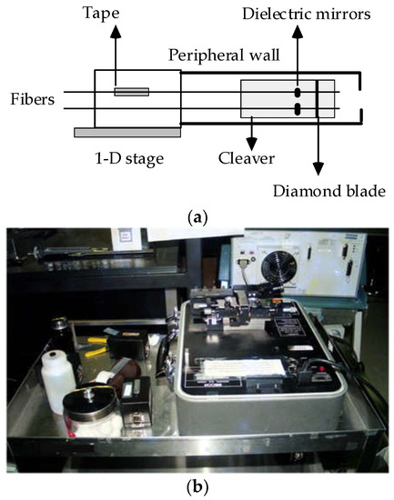 (a) Top view of the alignment of both fibers with dielectric mirrors on a cleaver and an adjustable 1D stage. (b) Contour of a splicer.