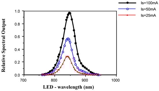 Relative spectral output vs. wavelength of the tested diode measured with a monochromator. There are three close Gaussian shapes at the forward currents: Is = 25, 50, and 100 mA [30].