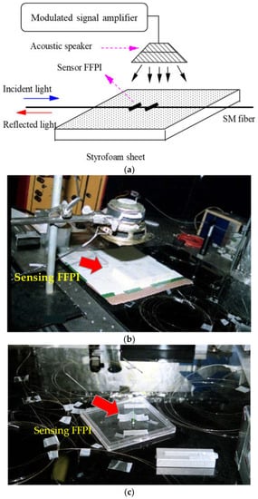Experimental arrangement to test the acoustic response of sensors with an acoustic speaker, a sensor FFPI, and a Styrofoam sheet: (a) schematic illustration, (b) physical setup, and (c) sensing FFPI outside the acoustic setup.