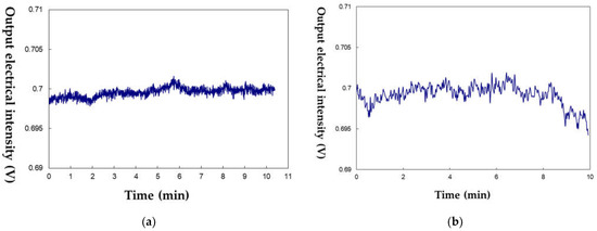 Using this LED light source, the operating stability is also an essential factor to ensure sensing performance. The stability consequences of this diode light source in short- and long-term tests sensed by an optical detector are exhibited in Figure 6. In general, the maximum and minimum peaks are 0.7015 V and 0.698 V, respectively, for the short-term test. The maximum value is 0.702V, with a minimum value of 0.694 V for the short-term test. This tested diode demonstrates the suitable stability of the expectation: below 1% at room temperature. These experiments were repeated in triplicate, with a performance variation of less than 1%. Then, a simulation was executed to achieve suitable reflectance, as shown in Figure 7 [30]. Here, the experimental reflectance of a single FFPI of R ≈ 0.1 was adopted.