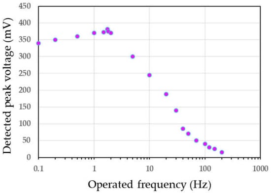 Following all preliminary experiments, an acoustic modulator as a perturbed dynamic sinusoidal acoustic signal at a frequency of 1.74 Hz, as shown in Figure 8a, was implemented in the sensing FFPI. The sensing cavity produced a disturbing phase shift as a result of either a change in cavity medium index or cavity length modulation. The transmitted output signal at the reference FFPI, as depicted in Figure 8b, responded simultaneously and in accordance with the frequency of the acoustic stress source. With respect to the measured stress result, this acoustic wave sensor successfully detected the measurand. The total sensing wave form (ΦT(t)) shown in Figure 8b is composed of Φsp(t), Φst(t), and Φr(t), indicating the signals from the speaker, Styrofoam sheet, and receiver, respectively. Because the acoustic wave in the Styrofoam sheet also generates some second-order disturbance in the sensing cavity, the entire waveform on the oscilloscope is distorted and not matched well with the original speaker signal. The signal noise on the waveform should chiefly come from the receiver. The frequency response is shown in Figure 9 in the frequency range of 0.1 to 200 Hz, indicating a cut-off frequency. The signal-to-noise ratio demonstrates a good performance at greater than 3 dB.