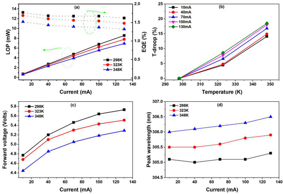 Figure 1a reveals the dependence of the EQEs and LOPs of the fabricated UVB-LED on the three tested temperatures and the various forward currents. The LOP increased monotonically when the forward current was increased to 130 mA, reaching maximum values of 8.6, 7.8, and 6.9 mW at 298, 323, and 348 K, respectively. The maximum EQEs at 298, 323, and 348 K (1.77, 1.69, and 1.52%, respectively) occurred when the value of If was 10 mA; at 130 mA, they decreased to 1.62, 1.48, and 1.32%, respectively. After applying Equation (1), we obtained J-droops of 8.47, 12.42, and 13.16% at 298, 323, and 348 K, respectively.