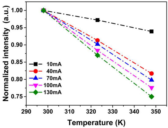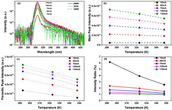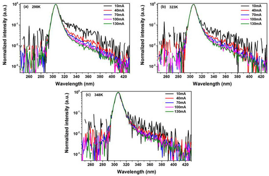 Figure 4 provides the normalized intensities of the peak wavelengths recorded at temperatures of 298, 323, and 348 K with forward currents applied in a range from 10 to 130 mA. In a previous study, Santi et al. observed a parasitic peak near 340 nm for their UVB-LED and attributed its origin to radiative transitions through deep levels in the QB next to the EBL and not inside the QWs [16].