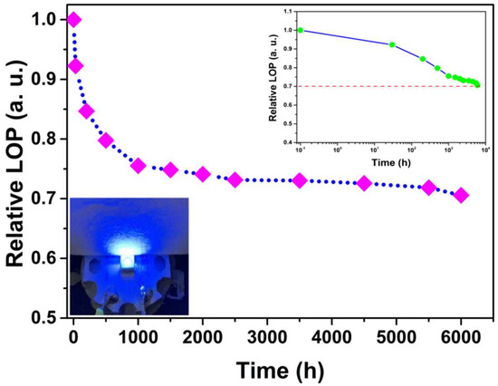 Relative LOP of the AlGaN-based UVB-LED, measured during aging tests performed at 40 mA. Insets: (left) photograph of the UVB-LED during operation; (right) LOP plotted on a logarithmic time scale.