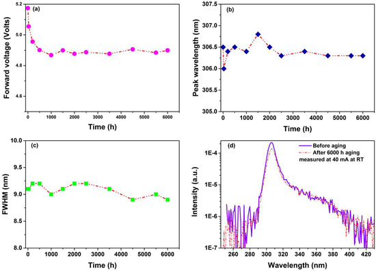 However, their paper reveals that a slower T-droop occurred when the temperature was greater than 300 K upon an increase in the value of If [16]. Nevertheless, in the present study, we did not observe a similar T-droop phenomenon when the temperature was 348 K. Furthermore, we found that the normalized intensities of the peak wavelengths underwent a steeper decline upon an increase in the temperature when increasing the value of If. According to the dependence of the emission intensity on temperature, Figure 4 indicates that at a higher forward current, the AlGaN-based UVB-LED exhibited weaker temperature stability. This trend is dramatically different from that reported previously [19]. Figure 5 presents the relative LOP measured over time for the UVB-LED operated at 40 mA (current density: ca. 28.5 A/cm2) and RT, as well as a photograph of the UVB-LED during operation. A rapid degradation in the LOP, to 79.7% of its initial value, occurred in the first 500 h of the aging operation; it then decreased more slowly to 70.6% of its initial value when the aging time reaching 6000 h (the inset in Figure 5 displays the LOP plotted with respect to a logarithmic time scale). Such behavior has been observed many times previously [21,22,23,24,25,26,27,28]. This performance is close to the specifications of commercial solid-state lighting products and the estimated 70% lifetime (L70) is comparable with values reported by Ruschel et al. for a 310 nm UVB-LED operated at a current density of 33.5 A/cm2 [21]. Figure 6a–c presents the time-dependence of the forward voltage, the EL peak wavelength, and the EL FWHM, respectively, which were all measured during aging tests performed with an If value of 40 mA. The forward voltage decreased dramatically at the onset of operation but remained stable during operation between 500 and 6000 h.