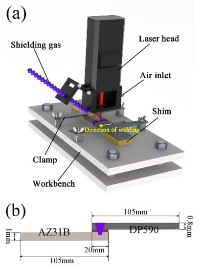 Lightweight is one of the important approaches to energy saving and emission reduction in the automotive industry. Furthermore, it is well known that the usage of lightweight metal is a good way to reduce the weight of automobile [,,]. Magnesium alloy, as one of the lightest metal materials, possesses low density, high specific stiffness and strength, and good vibration absorption and noise reduction performance, which is widely used in automobile industry [,,]. Steel is one of the leading materials widely used in various parts of automobile. Composite structure of magnesium alloy/steel has the advantages of reducing the overall weight and strengthening the local load-bearing, so joining of magnesium alloy and steel has also become one of the research hotspots. Compared with traditional welding methods, laser deep penetration welding has the advantages of high energy density, fast welding speed, low welding deformation, wide range of weldable materials, and high efficiency []. So, it has been widely used in joining dissimilar materials in recent years [,].