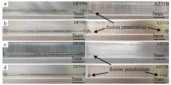 Weld appearance at the magnesium alloy side: (a) Cu−0%Si, (b) Cu−2%Si, (c) Cu−5%Si, and (d) Cu−8%Si.