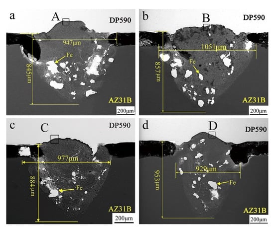 From Figure 4, it can be seen that light-colored phase distributes in blocks or particles inside the weld at the magnesium alloy side; and the light-colored phase is significantly reduced after the addition of Si. The EDS analysis shows that the light-colored phase is mainly composed of Fe (80.39 at. %), which indicates that the addition of Si can effectively inhibit the un-melted Fe from reaching molten pool at the magnesium side.
