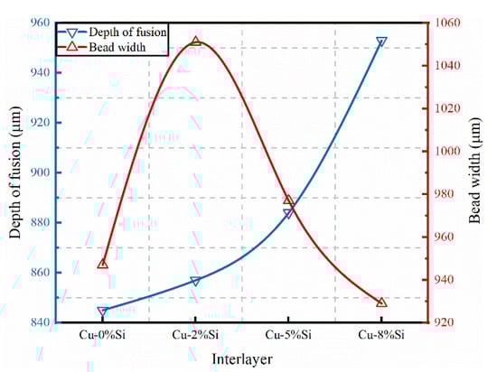 During the welding process, the wavelength of the laser remains constant. It can be seen from the above formula that when the laser wavelength maintains at a certain level, the laser absorptivity of the material depends on the resistivity of the material. The higher the resistivity is, the higher the laser absorptivity of the material is. The resistivity of Si is 2.52 × 10–4 (Ω·m), which is significantly higher than that of Cu (1.7 × 10–8 (Ω·m)) []. Therefore, the resistivity of Cu-Si composite powder is higher than that of pure Cu powder. With the increase of Si content, the resistivity of the composite powder also increases, which enhances the absorptivity of laser by the interlayer. So, the absorption of laser by magnesium alloy also increases accordingly, which increases the melting depth of the magnesium alloy side. In addition, the element Si can increase the specific heat of the liquid metal in the molten pool. According to the theory of Li CL [], the increase of specific heat of liquid metal can increase the laser power absorbing in the molten pool during the laser welding process, which can finally increase the melting depth at the magnesium alloy side.