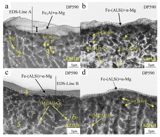 In order to investigate the effects of Cu and Si on the microstructure of the Mg-Fe interface of the joint, the middle part of the Mg-Fe interface in Figure 4 (marked as A, B, C, and D) in Figure 4 was selected for magnified observation. Furthermore, the magnification interface is shown in Figure 6; the EDS point analysis at each point in Figure 6 is shown in Table 2. It can be seen from Figure 6 that there is an obvious gray reactive layer at the magnesium alloy and steel interface, and the thickness of the reactive layer decreases with the increase of Si content in the interlayer. In addition, obvious air holes are observed in the weld at the magnesium alloy side when the Si content in the interlayer is 0%, 2%, and 5%, as shown in Figure 6a, Figure 6b, and Figure 6d, respectively. Moreover, a small number of cracks are also observed in the weld when the Si content is 2%, as shown in Figure 6b. However, when the Si content is 5% no obvious welding defects are observed (Figure 6c).