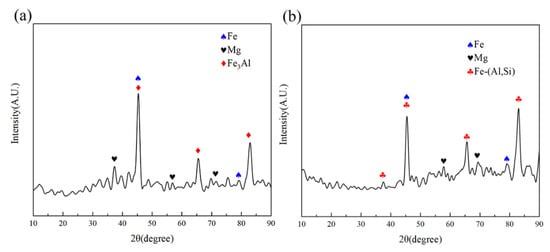 In order to further determine the phase of the reactive layer, micro-XRD analysis was performed on the reactive layer of the magnesium alloy/steel joint. The results are shown in Figure 7. It shows that the intermetallic compounds of Cu−0%Si and Cu−5%Si reactive layer are Fe3Al+α-Mg and Fe-(Al, Si) +α-Mg, respectively, which are consistent with the EDS results of Table 2.