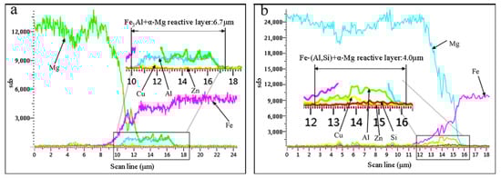 EDS line scanning of line A and line B of magnesium alloy/steel interface in Figure 6: (a) line A (Cu−0%Si) and (b) line B (Cu−5%Si).
