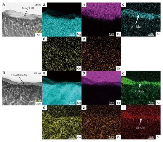 EDS map analysis at the magnesium alloy/steel interface in Figure 6: (A) Cu−0%Si and (B) Cu−5%Si.