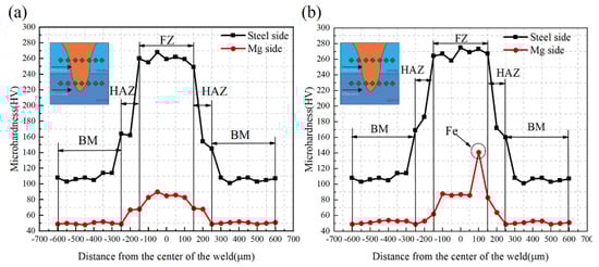 The microhardness test was carried out through the weld at both the steel side and the magnesium alloy side. Plus, the microhardness distribution of the magnesium alloy/steel joint with Cu−0%Si and Cu−5%Si interlayer is shown in Figure 10, respectively. It can be found that the microhardness of the joint presents a “convex” shape with the center of the weld as the axis of symmetry. The microhardness of the fusion zone (FZ) at both the steel side and the magnesium alloy side is the biggest, followed by the heat-affected zone (HAZ), and the lowest in the base material (BM), which is consistent with the result of Tao T [], who laser lap welded AZ31B-alloy to DP590-steel. The average hardness of the weld at the steel side with the Cu−5%Si interlayer (267.5 HV) is slightly higher than that with Cu−0%Si (263.1 HV). This is because Si can enhance the hardness of the steel []. During the welding process, a small amount of Si enters the steel side, which can enhance the hardness of the weld at the steel side.