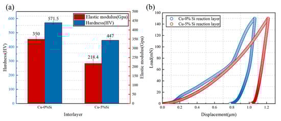 The hardness and elastic modulus of the reactive layer with Cu−0%Si and Cu−5%Si interlayer are shown in Figure 11a, respectively. Both the hardness and the elastic modulus of the reactive layer with the Cu−5%Si interlayer is much lower than those with the Cu−0%Si, as shown in Figure 11a. The load–displacement curves of different reactive layers are shown in Figure 11b. The results indicate that the plastic deformation capacity of the reactive layer improves and the ductility of the reactive layer increases when the reactive layer transforms from Fe3Al+α-Mg to Fe-(Al, Si) +α-Mg. This is beneficial for the release of residual stress in the joint and could improve the mechanical properties of the joints.