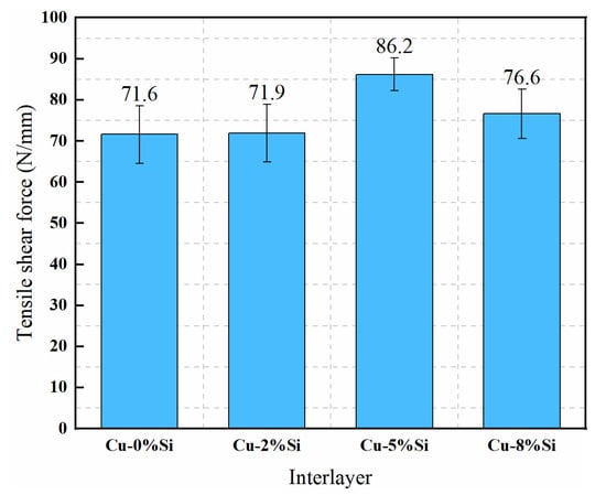 The tensile shear force of the magnesium alloy/steel joint with different Si content in the interlayer is shown in Figure 12. The tensile shear force firstly increases and then decreases with the increase of Si in the Cu interlayer. When Si content is 5%, the tensile shear force of the joint reaches the maximum of 86.2 N/mm, which is about 20.4% higher than with pure Cu interlayer. From the analysis of microstructure and nano-indentation, it is found that the addition of Si transforms Fe3Al IMC into Fe-(Al, Si) IMC and decreases the content of IMC in the reactive layer, which improves the ductility of the reactive layer. Furthermore, the thickness of the reactive layer is greatly decreased, which is also beneficial for the improvement of mechanical properties. However, with the further increase of Si content, the weld at the magnesium alloy side generates a large number of cracks, which reduces the tensile shear force of the joint.