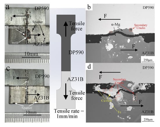 The macroscopic morphology of the fracture of the Cu−0%Si and Cu−5%Si joint and the cross-sectional after the tensile test are shown in Figure 13, respectively. It can be seen from Figure 13a,b that quite a lot of unmelted Cu remains at the magnesium alloy side near the fracture surface with the Cu-0%Si interlayer, which is not observed near the fracture surface with the Cu−5%Si interlayer. Moreover, the spatter on the magnesium alloy with Cu−0%Si interlayer is more than Cu−5%Si layer. From the cross section of the fracture shown in Figure 13c,d, it can be observed that the joint without and with Si addition fractures on the weld near the steel side and near the magnesium alloy side, respectively. In addition, the fracture location of the joint with Si addition presents a more tortuous cracking shape and much more secondary cracks, which indicates that it absorbs more energy during the tensile shear test.
