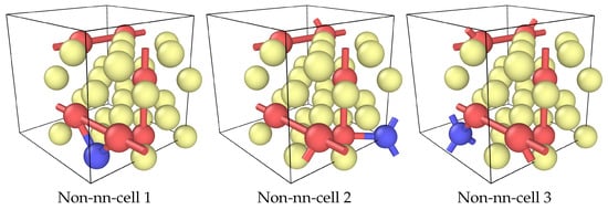 Interaction effects were calculated for Ni25Cr6X in the two SQS cells from Figure 3 and in the lowest energy cell without nearest neighbors, configuration 7 from Figure 2. There are three geometrically different positions in this cell as calculated using SOD [18], with 2, 3, and 4 nearest-Cr-neighbors of the alloying element, see Figure 4. These cells are denoted as “non-nn-cells” in the following. In all cases, different initial magnetizations for the alloying element and the Cr atoms were used to find the best final state.