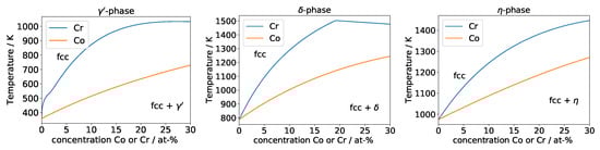 For the -phase, it should be noted that Thermocalc predicts that Cr preferentially dissolves in , so this solvus line does not capture a displacing effect, but rather a direct stabilization of the phase. For Co in and both for Co and Cr in and , Thermocalc predicts low solubility, so the solvus line should mainly represent the energy increase of the element in a matrix rich in Co or Cr.