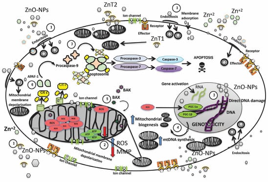 At the structural level, mitochondria are composed of an outer membrane and an inner membrane; the latter contains proteins involved in the electron transfer chain (ETC). The integrity of the ETC is crucial for ATP generation; as a result of its activation, reactive oxygen species (ROS) are generated. ROS are responsible for causing cellular stress, mutations and induce apoptosis [4]. The mitochondria carries a unique genetic material, which is characterized by having a circular double-strand (without ends) of nucleic acids called mitochondrial DNA (mtDNA), containing information to encode 37 genes—of which 13 genes encode for messenger RNA (mRNA), from which 13 mitochondrial proteins are subsequently obtained. Two genes encode ribosomal RNA (rRNA), and 22 genes synthesize transference RNA (tRNA). This smaller but no less critical genome is replicated, transcribed, and translated within the mitochondrial matrix, independently of cell cycle phases. Like nuclear genetic material, mtDNA is susceptible to genotoxicity produced by chemical (ZnO-NPs) and physical agents [12]. This review compiles the most relevant mechanisms leading to mitochondrial dysfunction caused by ZnO-NP exposure.
